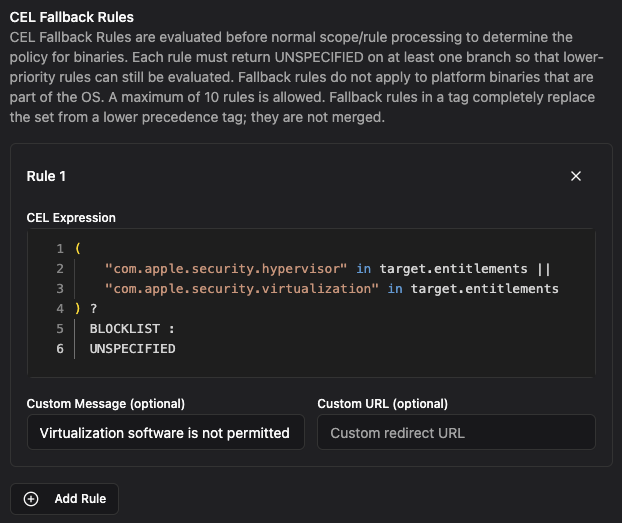 A common challenge in endpoint security is ensuring that a baseline policy is always enforced, even for binaries that don’t match any specific rule. CEL fallback policies solve this by letting you define global expressions that apply whenever no other rule matches.