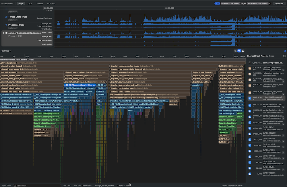 We invested significant time this release cycle analyzing CPU traces and flame graphs to identify and address performance bottlenecks. The result is a leaner, faster Santa that uses less memory and responds more quickly to authorization decisions.
