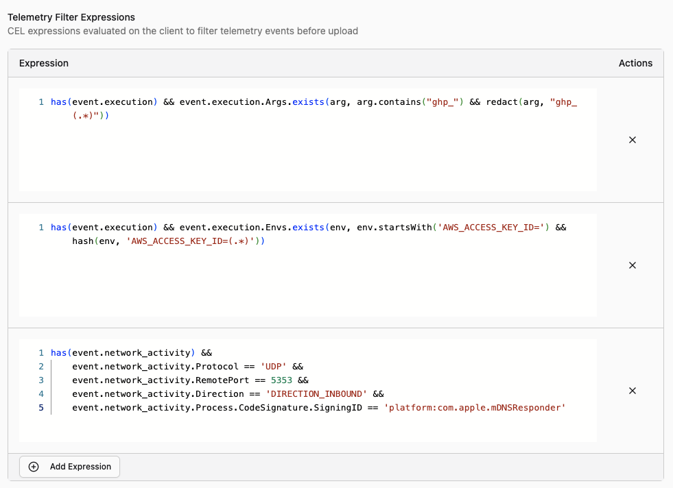 Having access to all of this telemetry is great but you want to focus on the events that are important, not the benign. Some processes execute thousands of times a day and generate telemetry that’s purely noise. Others contain sensitive information — command-line arguments with API keys, environment variables with database credentials — that you don’t want landing in a data lake where your entire security team (or a third-party SIEM vendor) can see it.